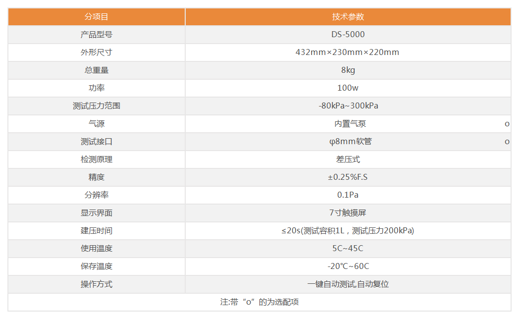 ●正壓:最大測試正壓:300kPa,建壓時間:≤20s(容積1L,壓力200kPa)