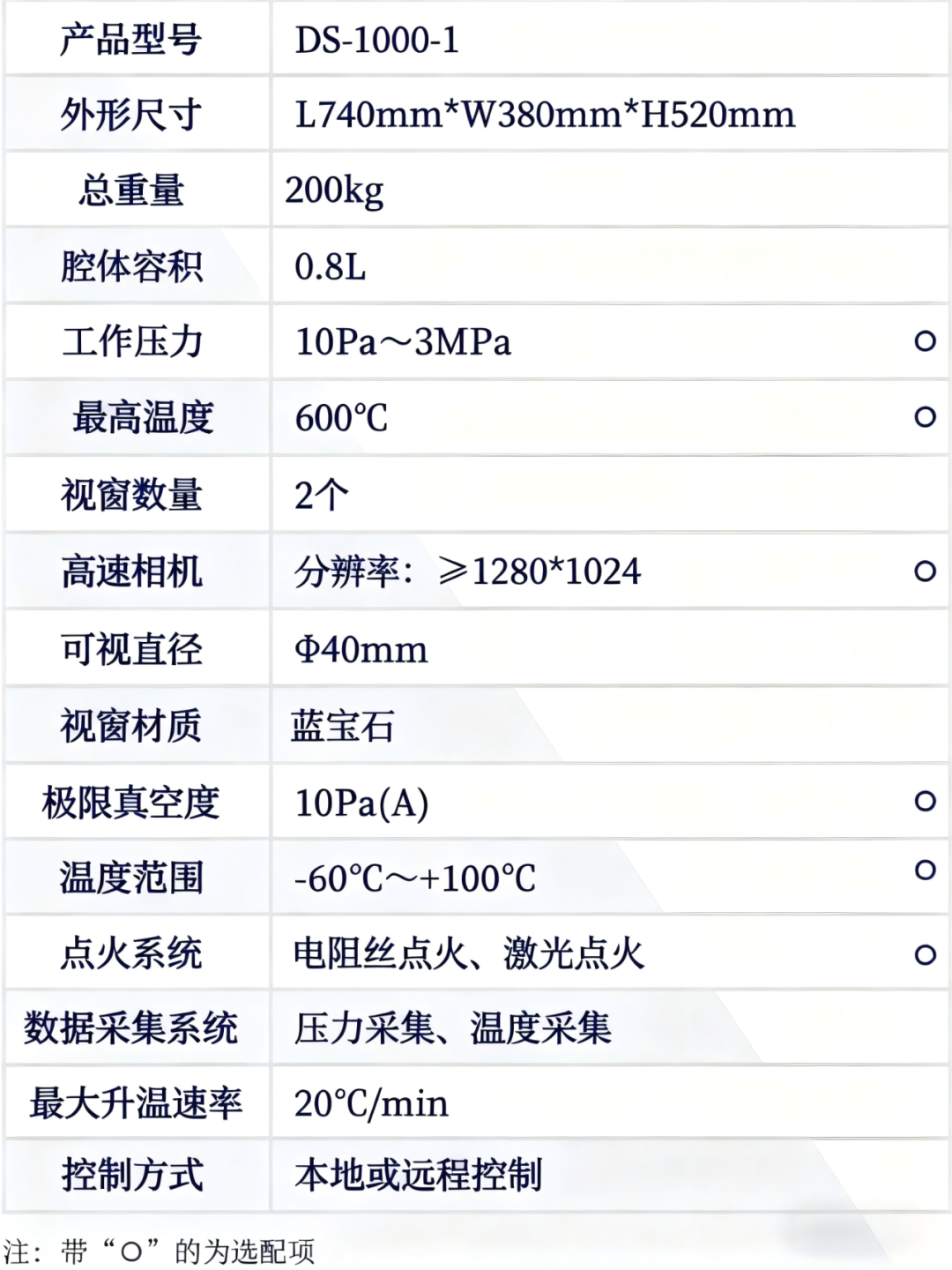 設備配有兩路進氣,可營造不同燃燒氣氛,包括壓力以及氣體成分等,試驗時正面配高速相機,可與點火同步觸發,頂部配有壓力傳感器和高溫熱電偶,記錄整個實驗過程。設備同時配有一路排氣、一路檢氣。