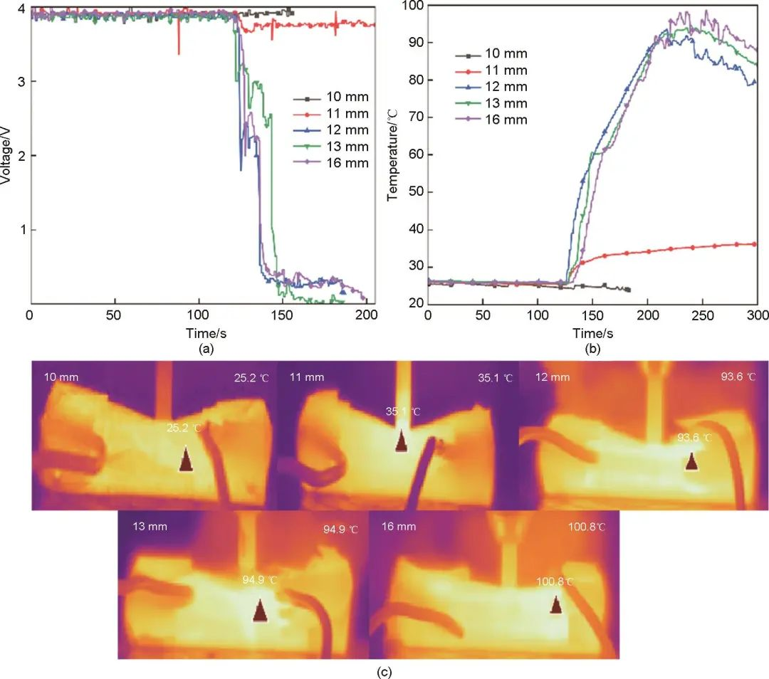 圖6(a)為電壓-時間曲線,可以清晰地看到當深度為10 mm時,電壓沒有發生變化,表明鋰電池內部沒有發生短路,當深度為11 mm時,電壓在124 s左右從3.9 V降到3.6 V然后又緩慢上升到3.78 V并一直維持在3.78 V左右,表明電池內部正負極已經發生了短接造成局部短路。分析電壓恢復的原因,當針刺部位局部熱量過高時,集流體、隔膜和穿刺點的局部區域可能會熔化,因此會切斷電流路徑,阻礙鋰電池進一步放電,隔膜和集流體是否熔化共同決定電壓下降是否可恢復。圖6(b)、(c)為溫度-時間曲線和熱像圖,從圖6(b)、(c)中可以清楚地看到電池表面峰值溫度隨著穿透深度的增加而增加。當針刺深度為10 mm和11 mm時,電池表面溫度不高,電池內部化學反應程度并不劇烈,并且也沒有噴出白煙和刺激性氣體,表明沒有發生熱失控。鋰電池刺穿10 mm時電池沒有發生短路,溫度一直保持在25 ℃左右。當針刺深度為11 mm時,電池內部正負極材料發生輕微接觸,觸發了局部短路,消耗了少量能量,升溫速率相對緩慢。從剛開始刺穿電池到電池溫度達到峰值時間大約為285 s,電池表面峰值溫度為35 ℃。當鋼針刺入深度為12 mm、13 mm、16 mm時電池均發生了熱失控,從刺入部位噴出刺激性氣體和白煙,并且電解液發生了泄漏。在刺穿外殼后溫度急劇上升并很快達到峰值,電池表面峰值溫度均超過90 ℃。綜上所述可知當鋼針刺入鋰電池時存在一個從局部短路到引起整個鋰電池內部短路的臨界深度。本工作選用的鋰電池臨界深度為11 mm左右。當穿刺深度小于臨界深度時,鋰電池不會發生熱失控,電池表面溫度上升緩慢。當穿刺深度大于臨界深度時,電池會發生熱失控,電池表面溫度急劇上升。