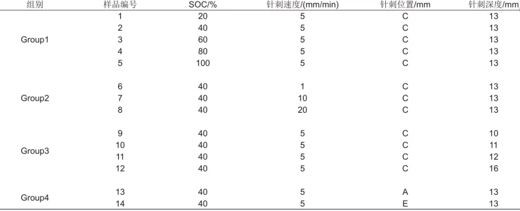 實驗方法參照GB 31241—2022《便攜式電子產品用鋰離子電池和電池組 安全技術規范》以及GB/T 38031—2020《電動汽車用動力蓄電池安全要求》。實驗考慮了SOC、速度、位置和深度4個因素的影響,其中包括4組實驗,參數設置如表2所示。圖2給出了實驗測試中鋼針的針刺位置,3個位置分別在鋰電池頂部、中部和底部。鋼針刺穿電池后觀察1 h再取下電池保存當前實驗數據。每次實驗結束后擱置30 min,檢查鋼針和保護箱內溫度情況,等恢復到室溫后再進行下一次實驗。此外,所有的實驗條件均采用控制變量法排除無關因素的影響。并且每組實驗至少重復3次,取重復性較好的一次實驗數據進行研究,以排除實驗的偶然性,保證實驗數據的準確性。