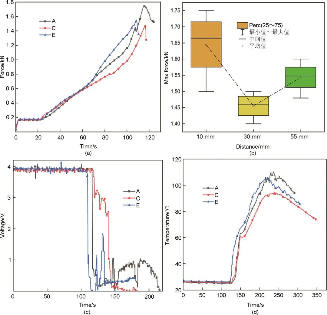 圖5 (a)不同速度加載下的載荷-位移曲線;(b)極限載荷箱線圖;(c)電壓-時間曲線;(d)溫度-時間曲線