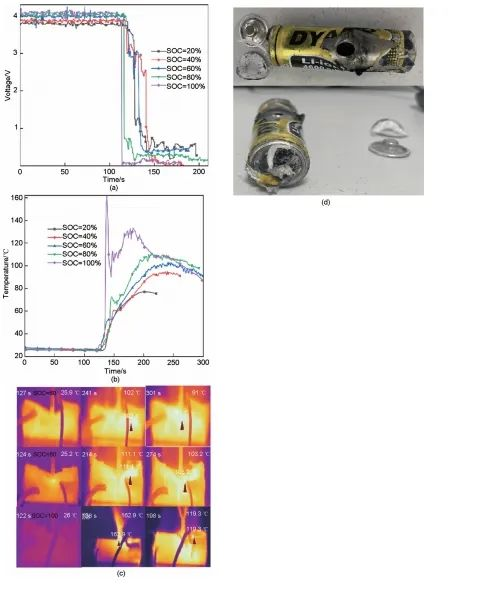 不同荷電狀態下載荷-時間曲線如圖3(a)所示。5種荷電狀態下的曲線前段趨勢大致相同,先經歷一段線性增長階段,然后進入緩慢增長的平臺區,承載力變化很小,接著進入高速增長階段,呈現指數式增長。這是因為鋰電池鋼制外殼與內芯、內芯各層極片和隔膜之間,以及最內部的中空部分存在間隙所致,實驗加載初期,電池鋼制外殼最先開始承受載荷,持續加載到一定程度后,接著開始擠壓內芯層與層之間以及最內部中空部分的間隙。所以初始階段載荷變化很小,等電池內部間隙被壓實后,載荷迅速增加。電池外殼強度失效被刺破瞬間產生的載荷稱為極限載荷。從圖3(a)可以看到極限載荷與SOC并不是簡單的增長關系,SOC為60%時對應的極限載荷最大。可能的原因是,負極材料的嵌鋰量隨著SOC的提高而增多,所以60%SOC的電池相比60%SOC以下的電池,具有更強的承載能力。當SOC大于60%時,鋰電池內部活性化學物質含量逐漸增高,在針刺過程中熱失控反應劇烈,從正極安全閥和針刺位置溢出大量氣體導致鋰電池發生鼓脹和有限滑動,從而導致其反作用力減小,因此此時鋰電池的嵌鋰量的變化和有限滑動的產生將導致其極限載荷下降。為了排除實驗偶然性,Group1在每種荷電狀態下做了多次重復性實驗,圖3(b)為多次實驗在不同荷電狀態下的極限載荷箱線圖,從圖3(b)中可以看到電池平均極限載荷與SOC并不是簡單的增長關系。當SOC為20%~60%時,鋰電池平均極限載荷隨SOC的增大而增大,SOC為60%的鋰電池平均極限載荷大于80%。當SOC為80%~100%時,同樣隨SOC的增大而增大。最大的平均極限載荷為1.66 kN(SOC=60%),比SOC為20%的平均極限載荷提高了20%。圖4(a)為不同SOC下電池的電壓時間曲線。實驗結果表明,電池SOC對其電壓響應有一定影響,對比圖3(a)和表3可以看到電池端電壓下降的時間點與電池達到極限載荷的時間點高度一致,表明電池內部短路發生于刺破的瞬間。SOC為20%和40%的電壓并沒有在極限載荷下降時間節點處驟降為0 V,而是先出現一段波動再降到0 V左右。分析其原因可能是低SOC條件下電池內部化學物質反應活性降低,在短路時并沒有立刻發生反應。圖4(b)、(c)為不同SOC條件下的溫度-時間曲線和部分紅外熱像圖。經過對比可以發現,電池的荷電狀態越高,升溫越早,并且對應的峰值溫度也越高。一方面,SOC越高,對應的初始電壓越大,當鋼針在刺穿電池經歷短路時,根據焦耳定律Q=(/R)×t,電壓越高,產生的焦耳熱越多,升溫速率越快。另一方面,高SOC鋰電池內部化學物質含量高,鋼針刺入電池短路時反應劇烈。圖4(c)所示鋰電池均發生了熱失控,電池變形后從針刺位置流出電解液并且冒出大量白煙。加載后期,電池溫度在短時間內迅速升高并伴有刺激性氣體迅速排出,這是由于鋼針刺破鋰電池外殼后,內部活性物質和電解液與空氣發生氧化還原反應。圖4(d)是SOC為100%狀態下針刺后的變形圖,在加載136 s左右發生爆炸,正極安全閥被彈出,冒出大量白煙并且在爆炸瞬間最高溫度達到162.9 ℃。由于在爆炸瞬間大量氣體從針刺部位溢出,因此可以看到電池針刺部位破壞嚴重且出現鼓脹。