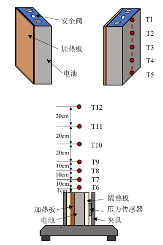 電池熱失控火災過程復雜且危害性大,通常伴隨大量熱量及毒害性氣體釋放。因此,積極開發高效滅火材料對防止電池熱失控事故的發生并減少損失十分重要。現有研究表明氣凝膠具有密度低且結構穩定不易發生畸變、導熱能力差、熱穩定性好等特殊優勢,作為一種新型滅火材料,對于固體、液體類火災具有較好的防治效果,但其在抑制電池火災方面的有效性尚待驗證。因此,此論文旨在研究氣凝膠泡沫滅火劑抑制鋰離子電池熱失控的效果和鋰離子電池熱失控規律,為進一步探尋鋰離子電池熱失控快速有效的抑制方式打下基礎。鋰離子電池的熱失控過程狀態可由測量得到的電池外殼溫度、火焰溫度、電池膨脹導致的擠壓應力三種特征參數判斷。實驗設置如圖1所示。