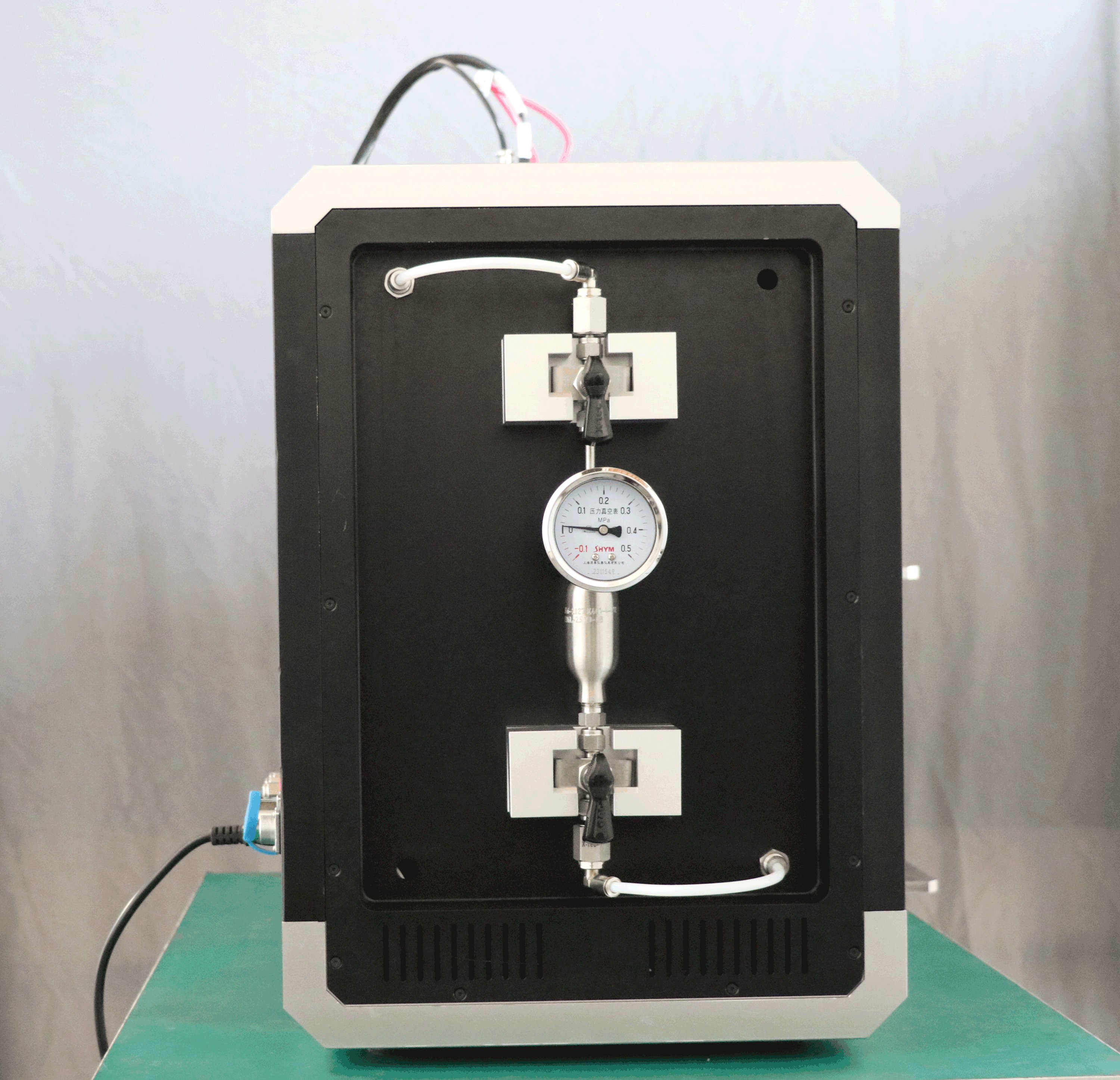 設備配有一路排氣、一路檢氣以及一套氣體取樣裝置。采樣裝置懸于設備左側,便于采集取放,取樣瓶容量為25ml。